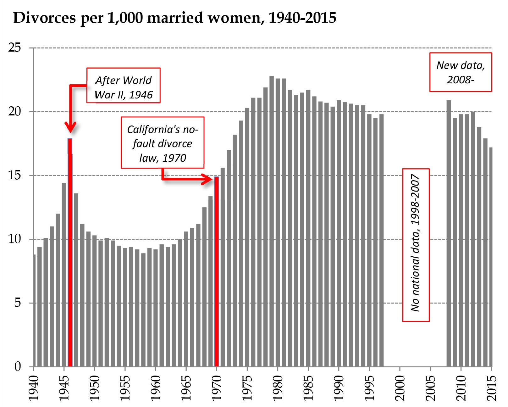 This is the lowest rate we have seen in 50 years. Americas divorce rate began climbing in the late 1960s and skyrocketed during the 70s and early 80s as virtually every state adopted no-fault divorce laws.